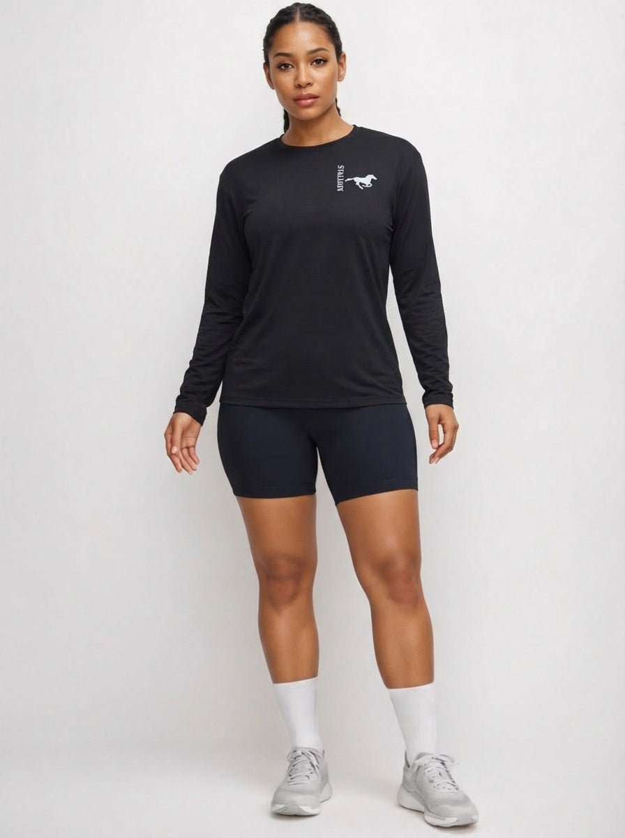 Soft and sleek, great for "going-out", Side Stallion Long Sleeve Knit Tee Shirt offers a great "look and feel", is also moisture wicking. Polyester and Spandex fabric.