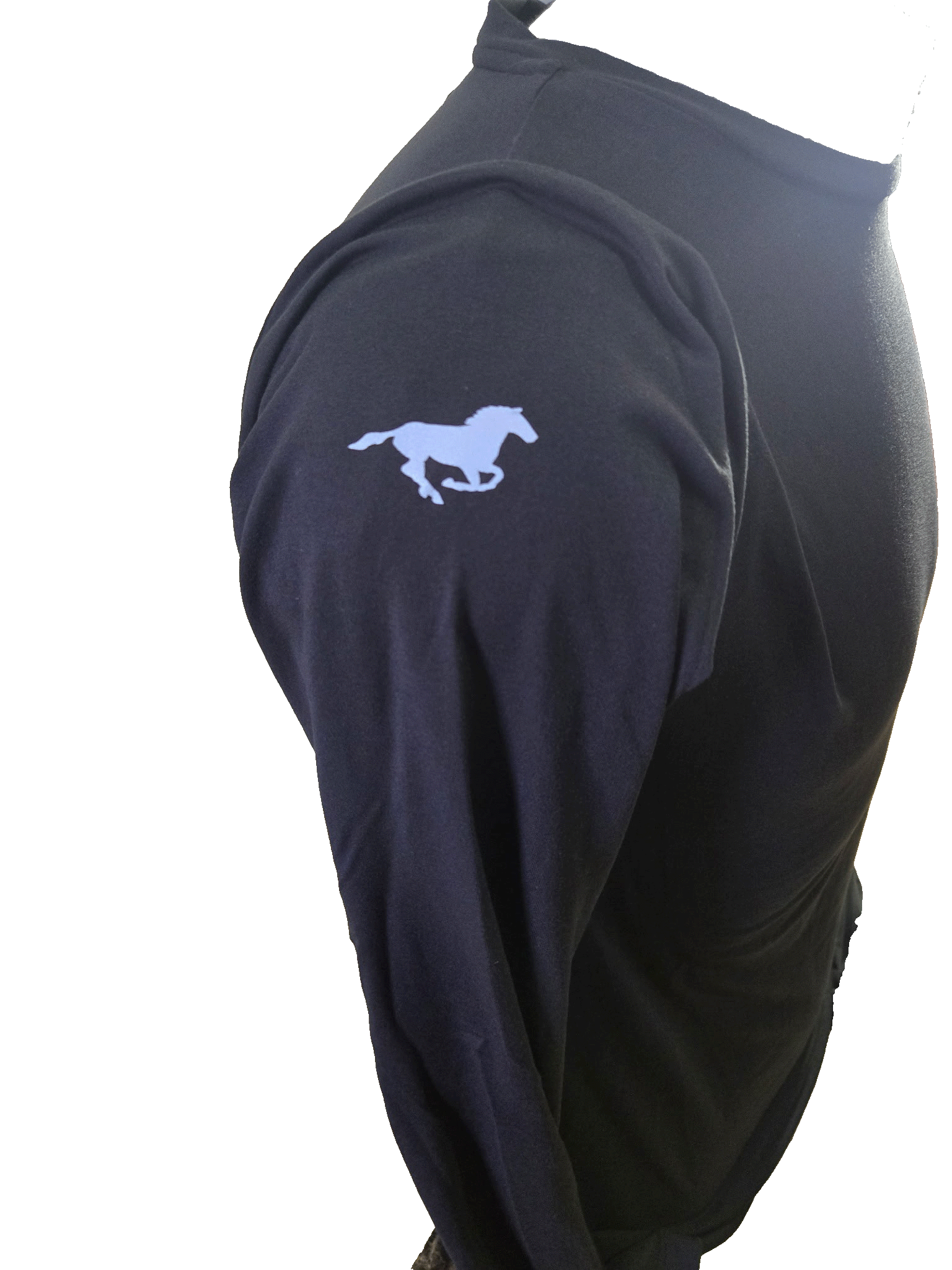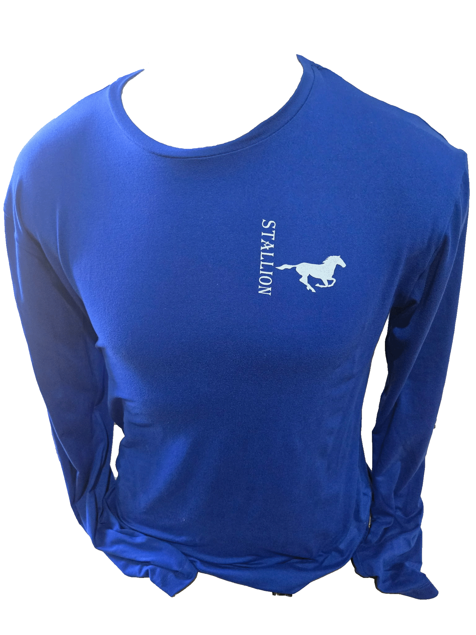 Soft and sleek Side Stallion Long Sleeve Knit Tee Shirt offers a great "look and feel", is also moisture wicking. Polyester and Spandex fabric.