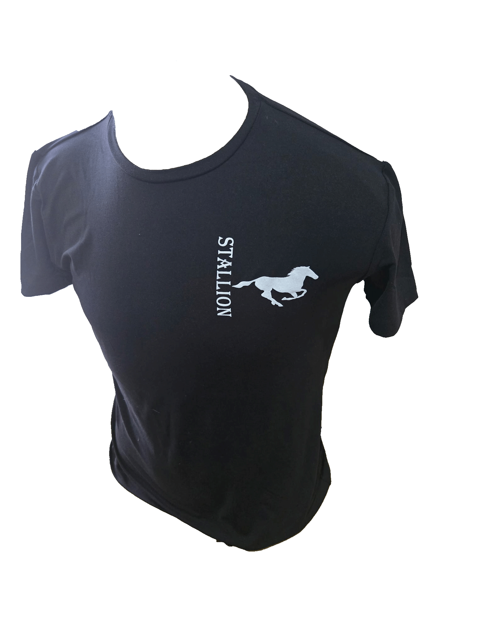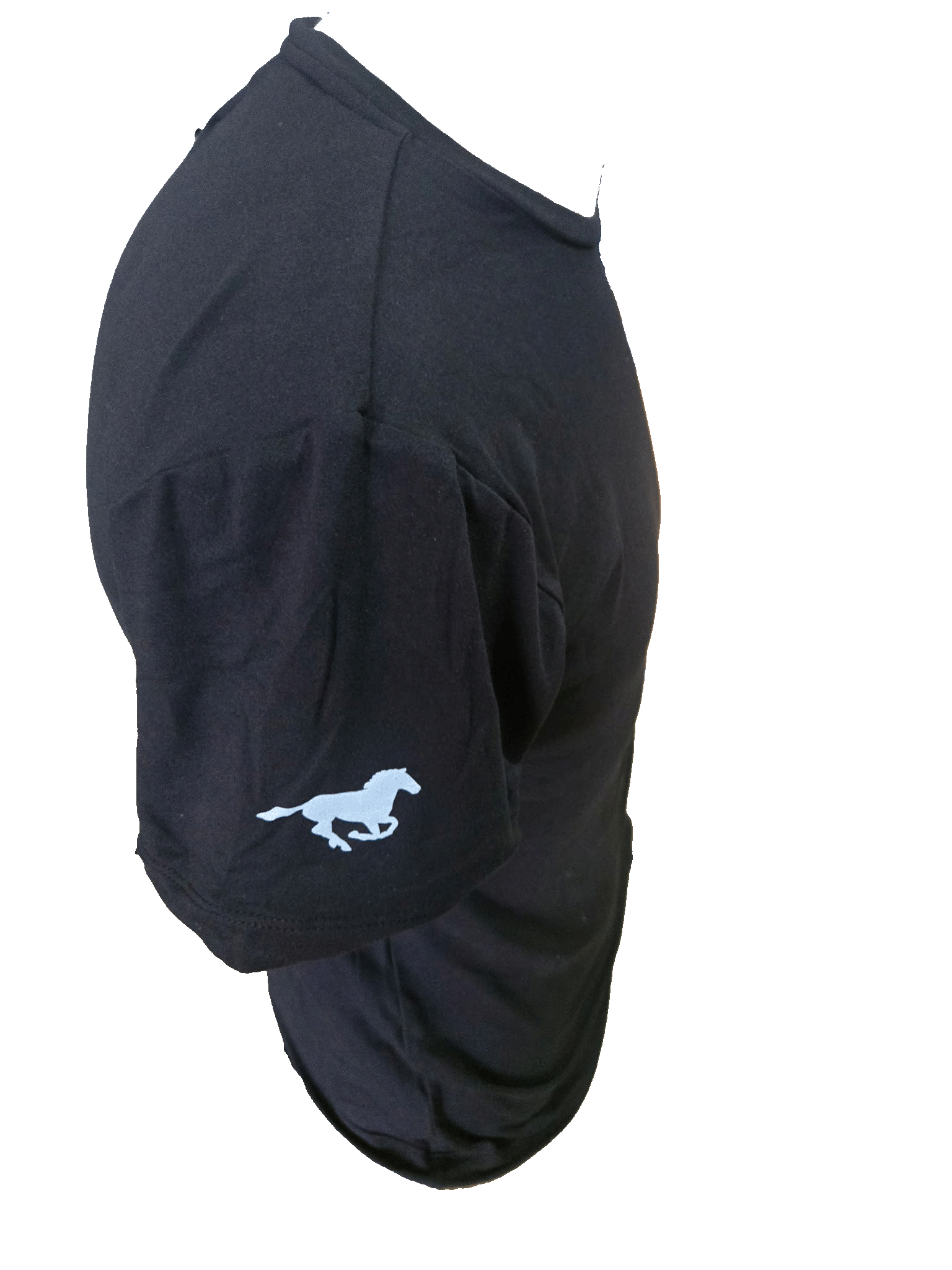 Soft and sleek Side Stallion Knit Tee Shirt offers a great "look and feel", is also moisture wicking. Polyester and Spandex fabric.