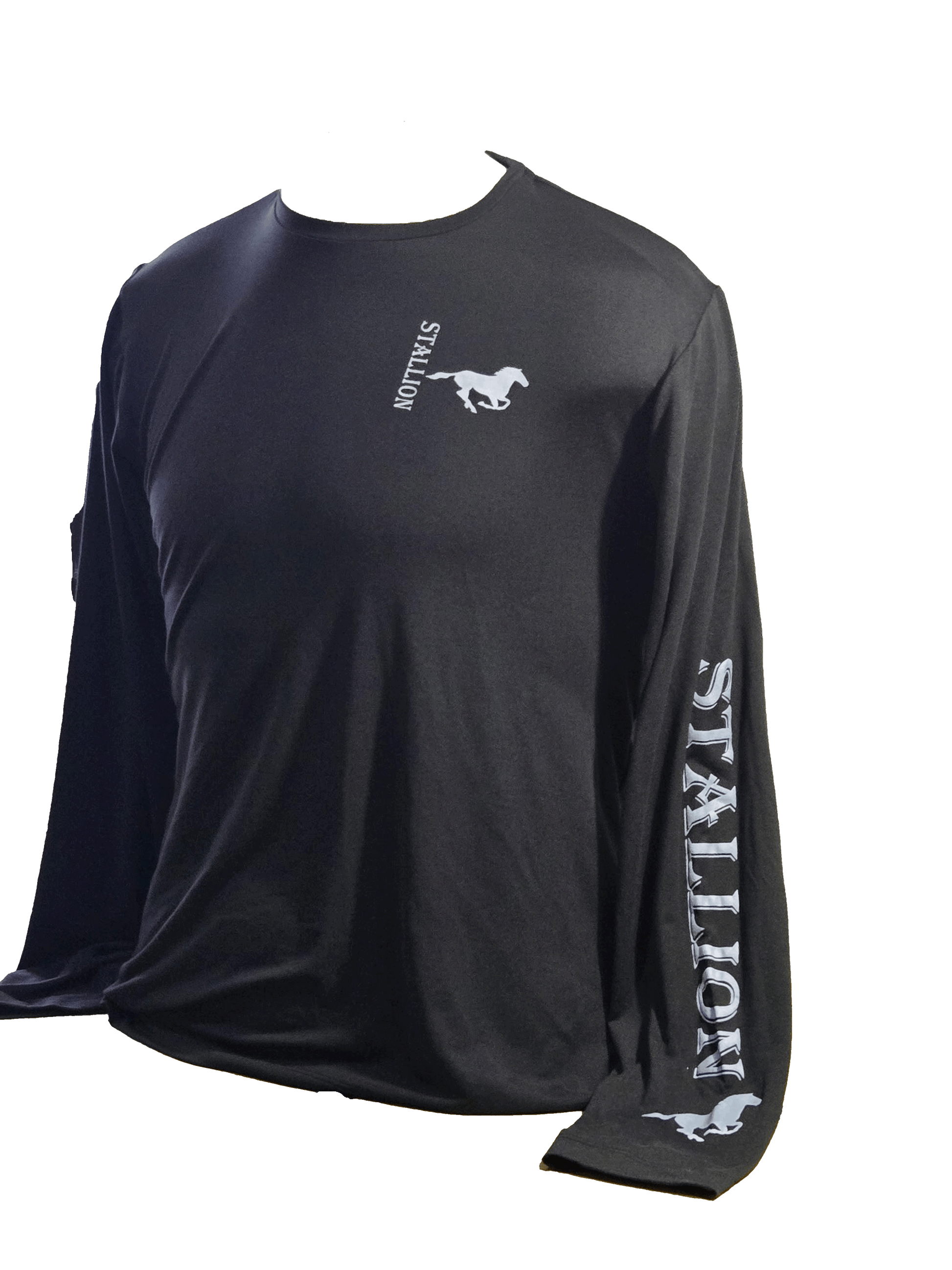 Soft and sleek Side Stallion Long Sleeve Knit Tee Shirt offers a great "look and feel", is also moisture wicking. Polyester and Spandex fabric.